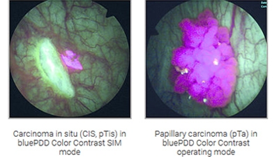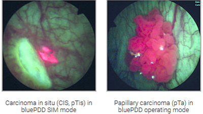 BluePDD modunda, tümörlü doku floresan kırmızı renkte görüntülenir. Mesane duvarının geri kalanı parlak ve yüksek kontrastlı görünür ve bu olağanüstü bir genel görüş imkanı sağlar.